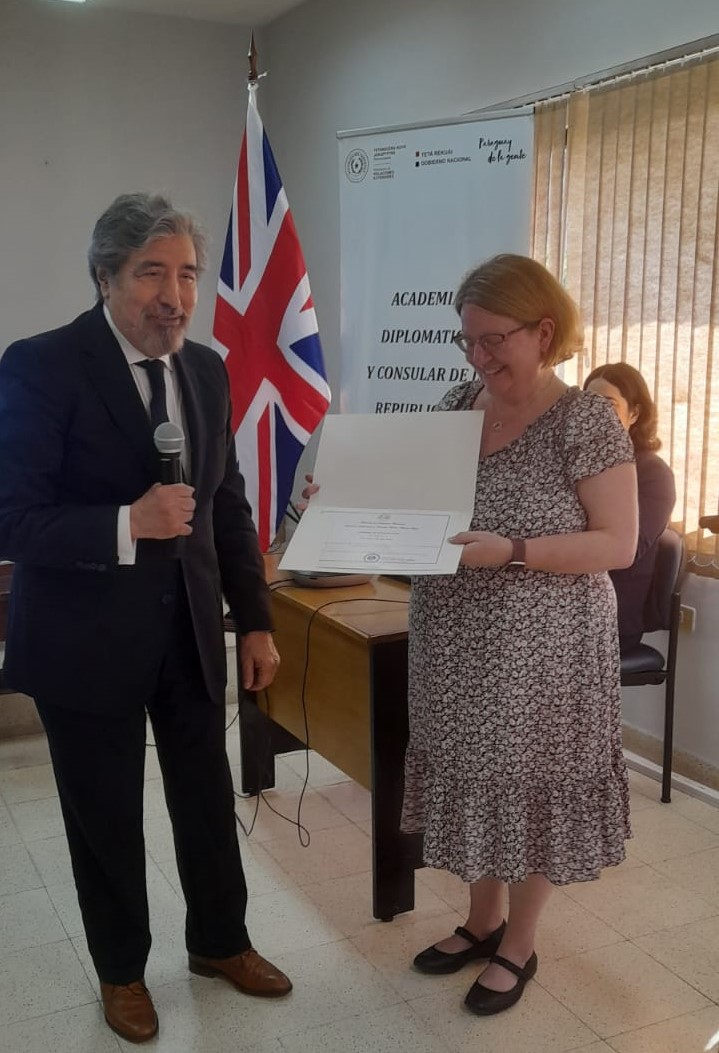 Una ilustrativa conferencia realizó hoy en la Academia la Embajadora Carol van der Walt, de la Cancillería británica. El tema abordado fue: Mujeres en la diplomacia. El camino de la Cancillería británica hacia una diplomacia diversa e inclusiva. La disertación generó una activa participación de los funcionarios de nuestra Cancillería. Especialmente, mostraron interés en los procesos sobre la inclusión de las mujeres en la diplomacia británica y su avance hacia la igualdad.