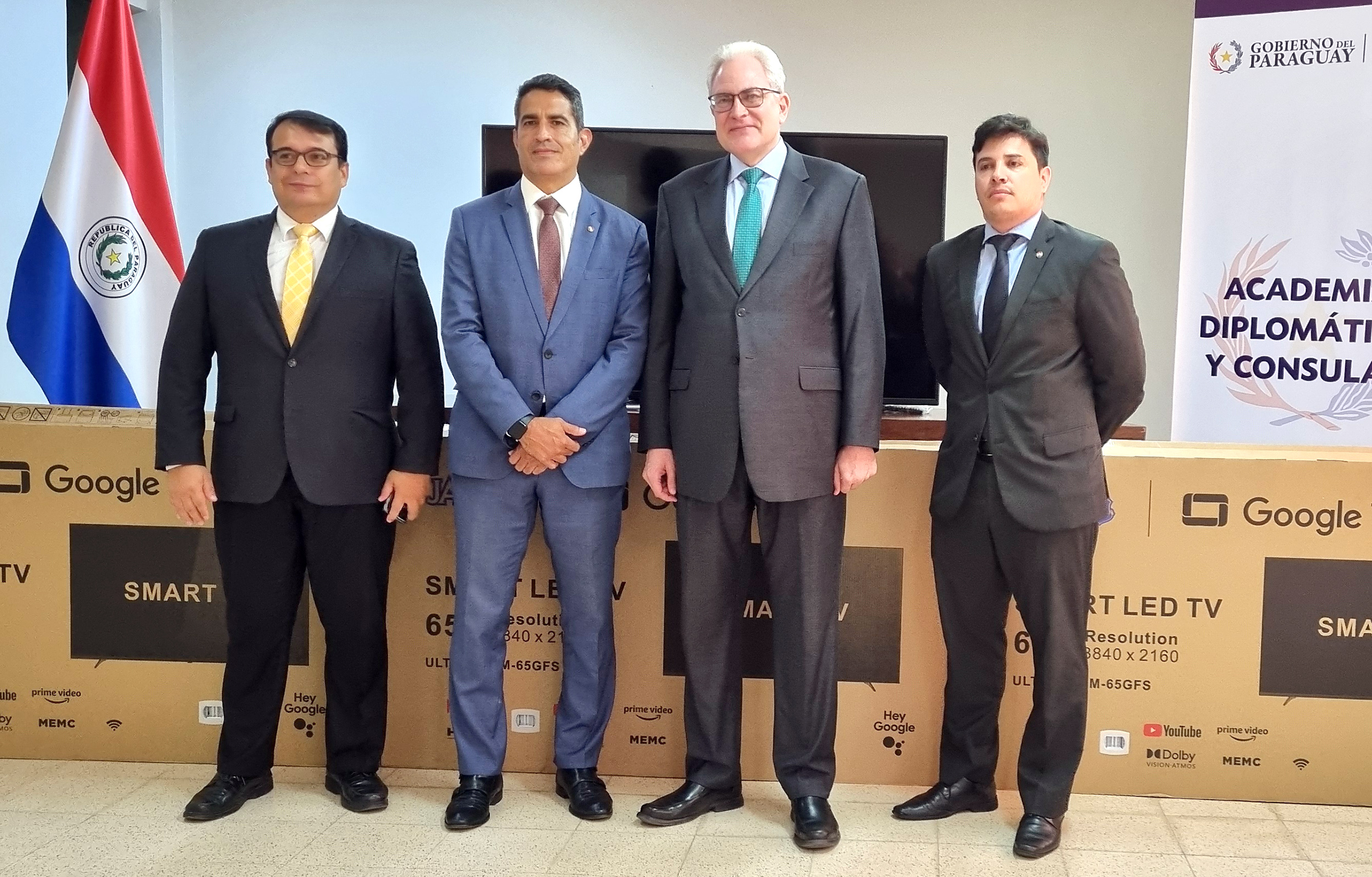 En un acto realizado en la sede de la Academia Diplomática y Consular, la Asociación de Funcionarios de la Carrera Diplomática y Consular de la República del Paraguay hizo entrega de tres televisores Smart, de 65 pulgadas, a ser destinados para el uso en las aulas donde se imparten los diferentes cursos académicos de formación, perfeccionamiento, actualización e idiomas.