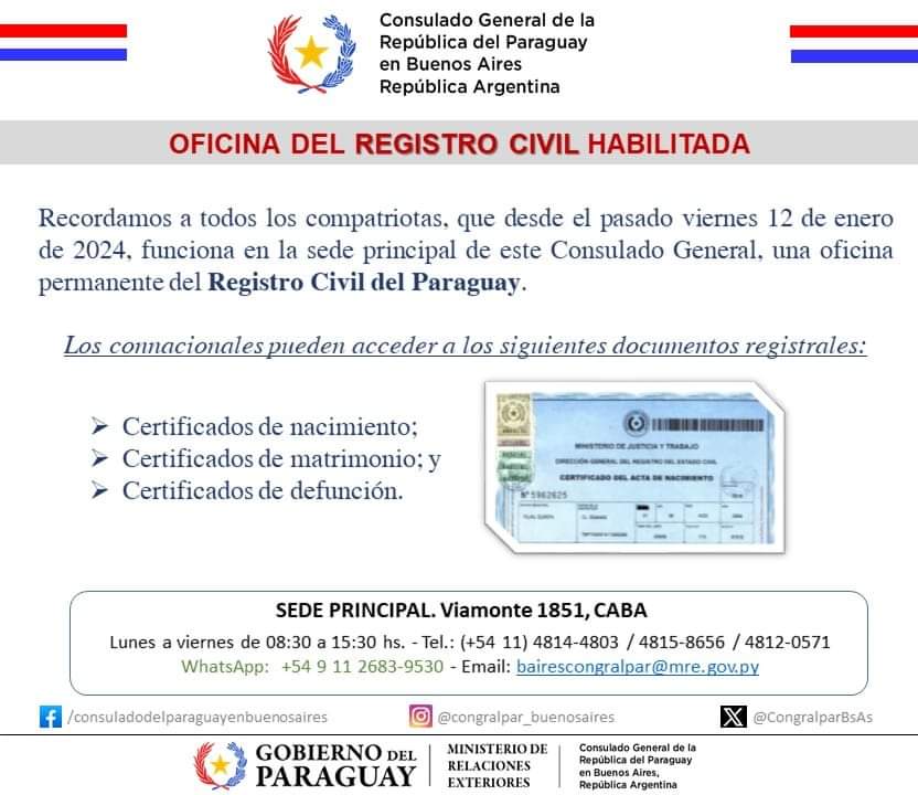 A partir del 12 de enero de 2024, funciona de manera permanente una oficina del Registro del Estado Civil en la sede del Consulado General del Paraguay en Buenos Aires, en cumplimiento al Convenio de Cooperación Interinstitucional entre el Ministerio de Relaciones Exteriores y el Ministerio de Justicia – Dirección General del Registro Civil, suscrito el pasado 22 de diciembre de 2023, en Asunción.