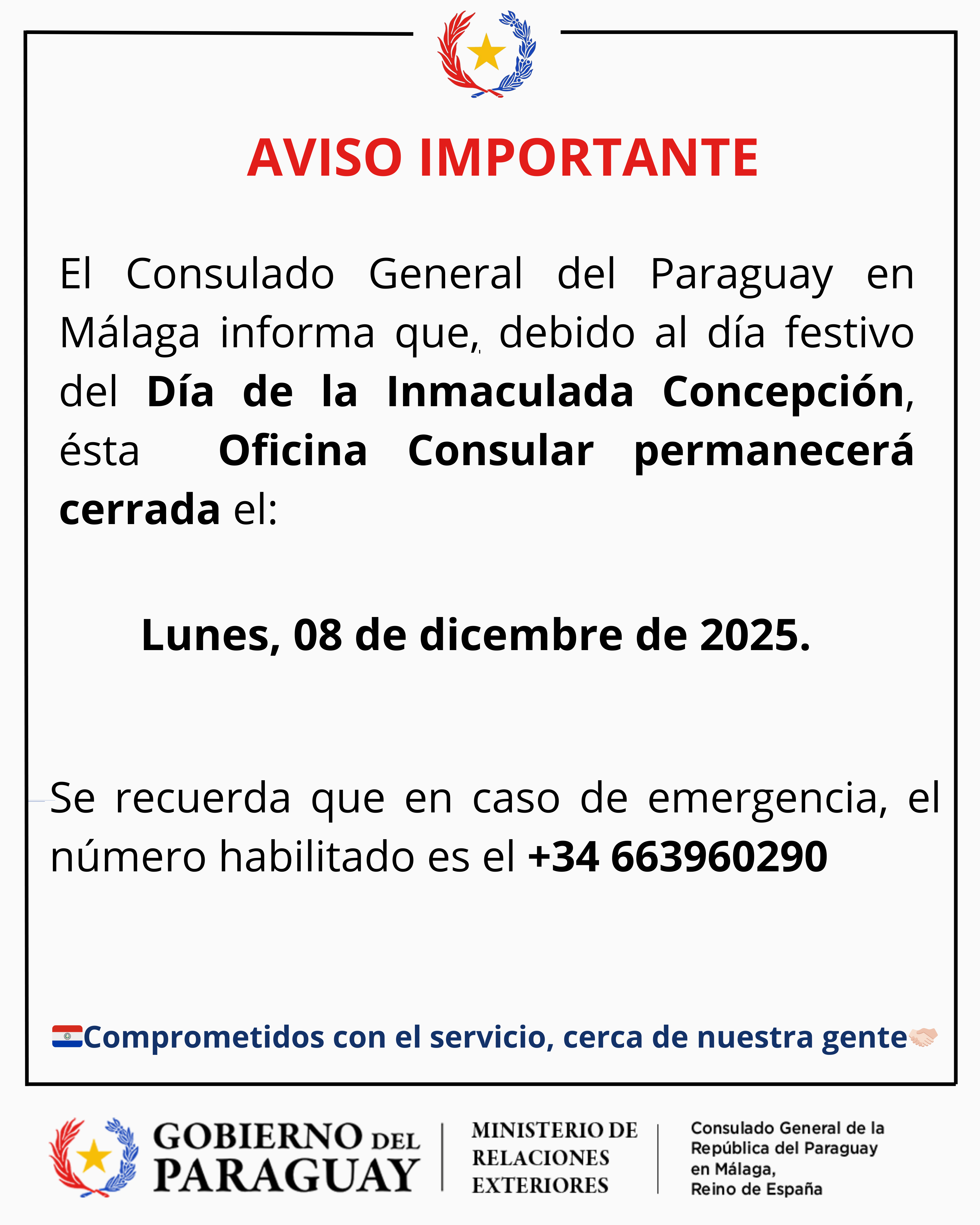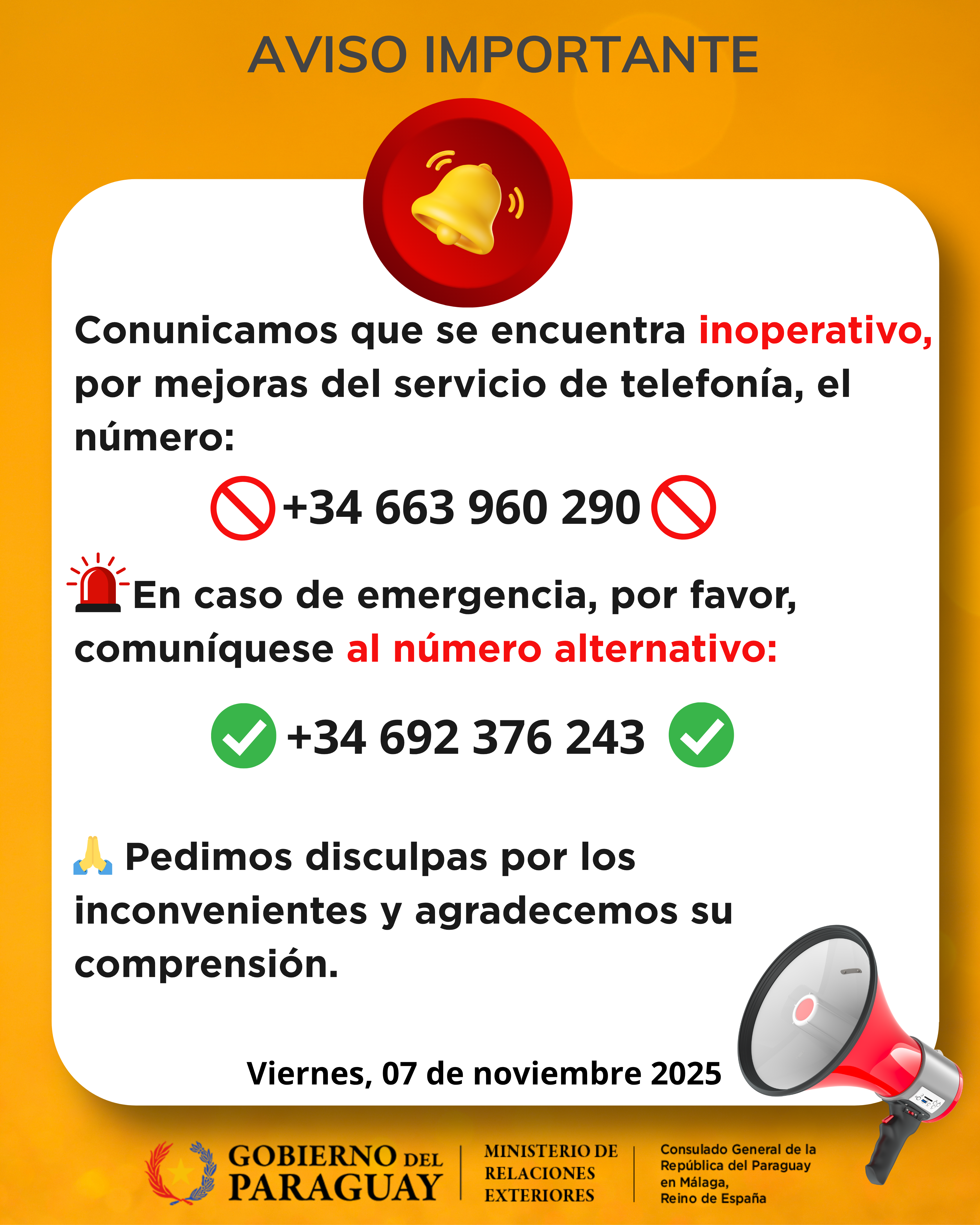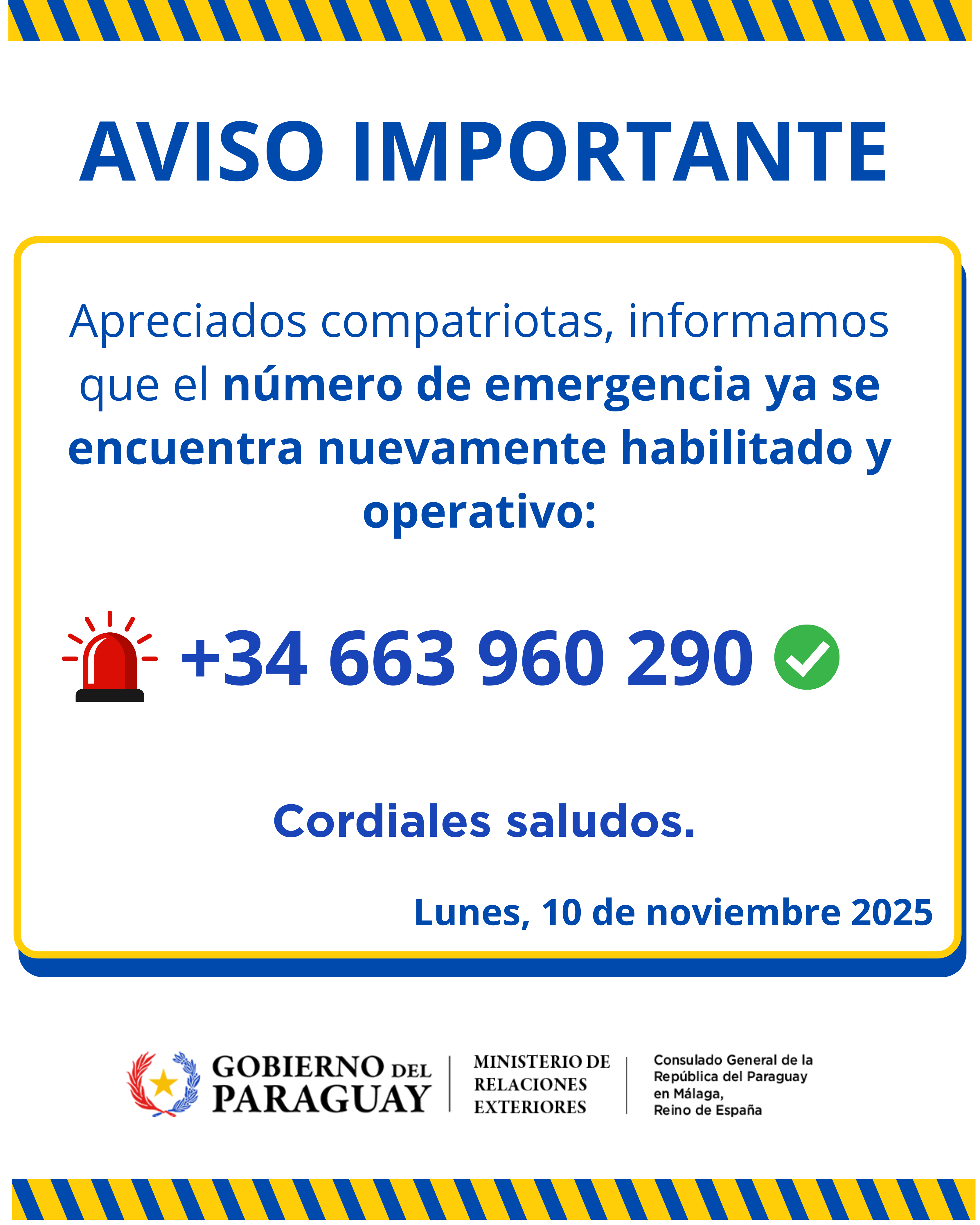 El número de emergencias está habilitado exclusivamente para situaciones de extrema urgencia, como fallecimientos, accidentes graves, víctimas de delitos o detenciones. No se brindará información de carácter general a través de esta línea. Este servicio está reservado únicamente para ciudadanos paraguayos que residan en Andalucía, Región de Murcia, Ceuta y Melilla y que se encuentren en una situación de emergencia real.
