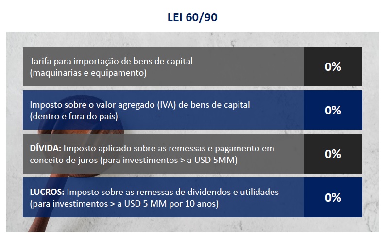 - Para dez (10) anos, quando os investimentos forem oriundos de recursos de repatriação de capital, ou quando os investimentos se radiquem em zonas de preferente desenvolvimento, ou ainda quando os investimentos forem superiores a USD 5.000.000 (cinco milhões de dólares).