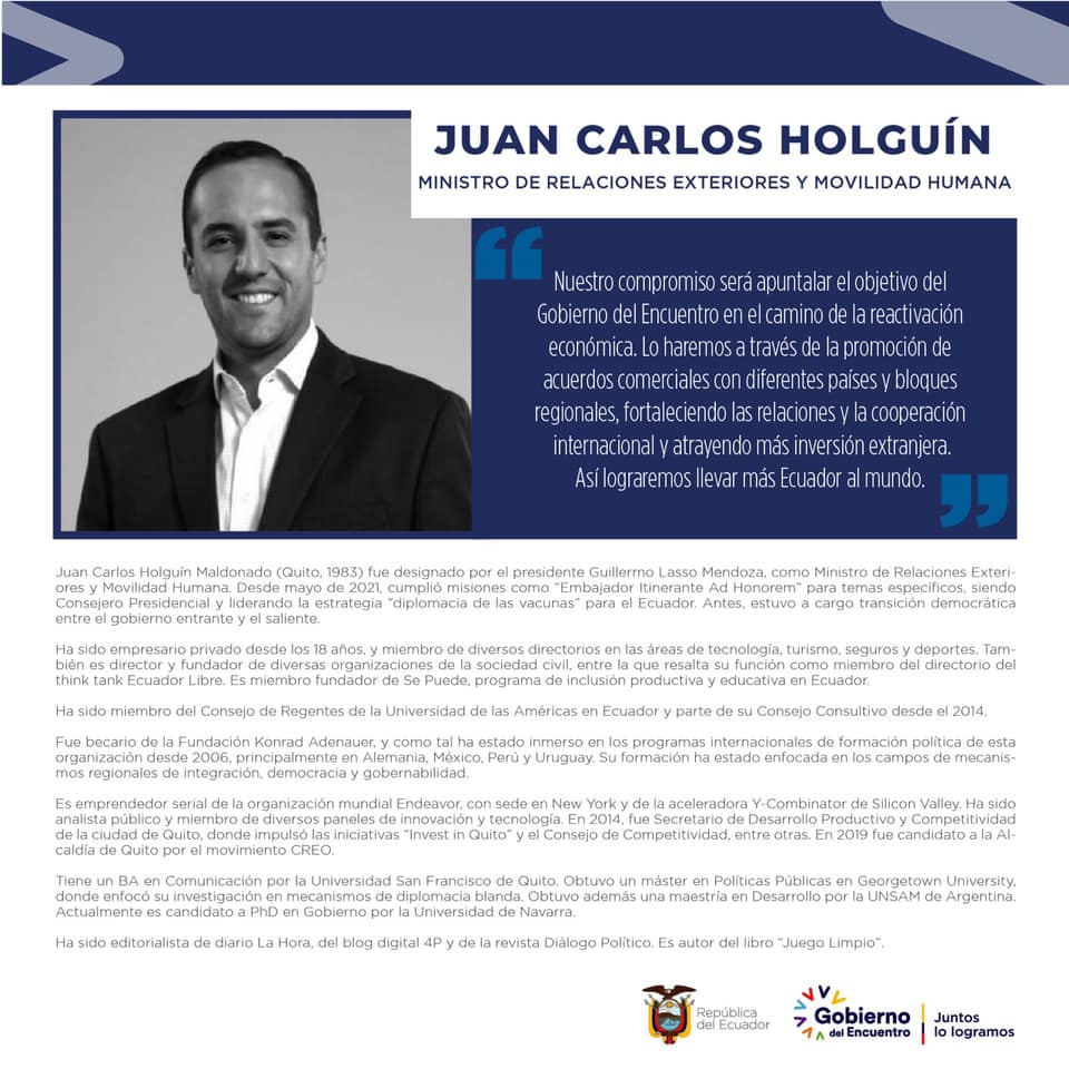 Este 3 de enero de 2022, Juan Carlos Holguín fue posesionado como Ministro de Relaciones Exteriores y Movilidad Humana por el presidente Guillermo Lasso, en el Palacio de Carondelet.