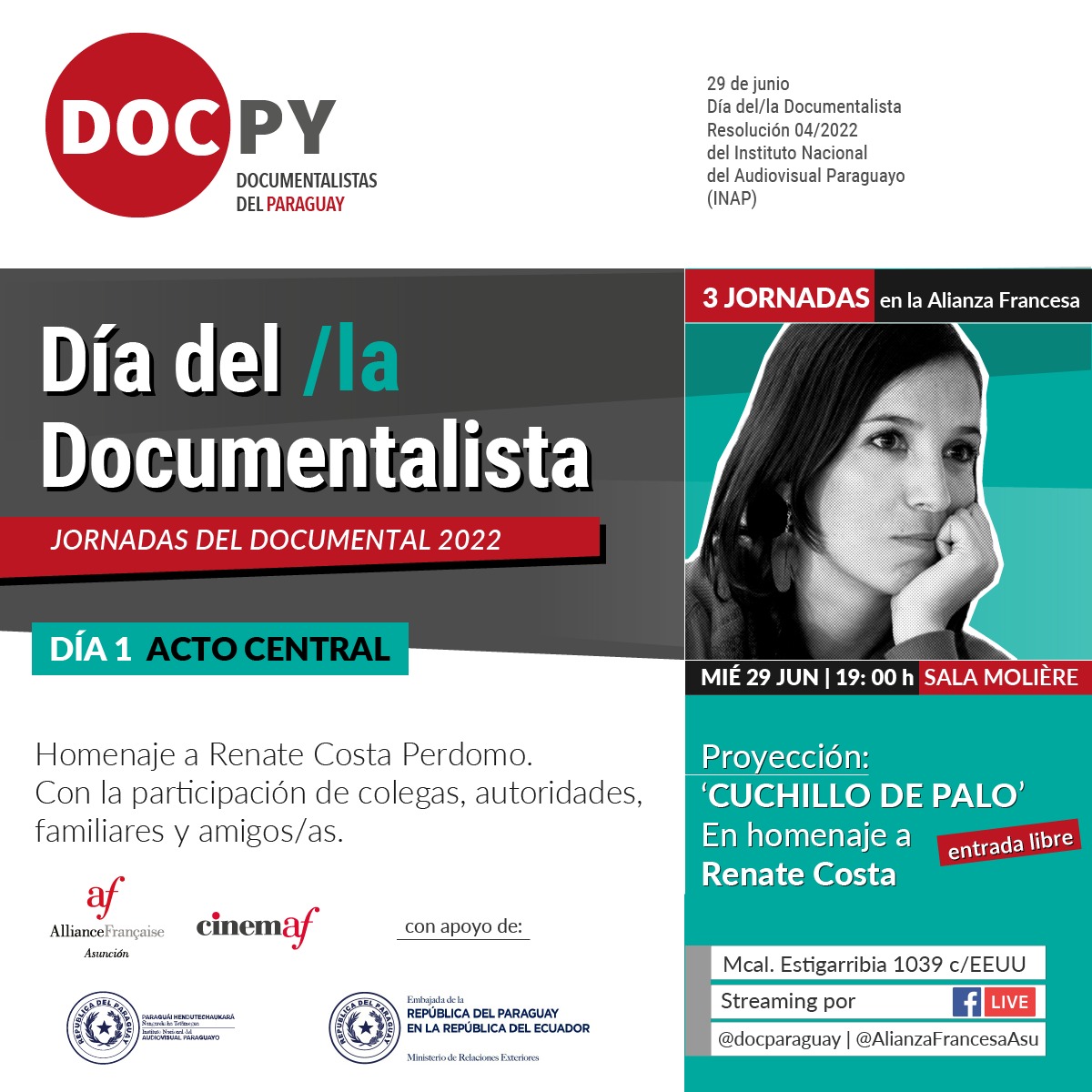Celebramos el día del / la documentalista del Paraguay presentando las 3 JORNADAS DEL DOCUMENTAL 2022, organizadas por los Documentalistas del Paraguay de acuerdo a la resolución 04/2022 del Instituto Nacional del Audiovisual Paraguayo (INAP), presencialmente en la sede de la Alianza Francesa de Asunción y virtualmente en los canales digitales de la Embajada del Paraguay en Ecuador, los días 29 y 30 de junio y 1 de julio, a las 18h00 Ecuador - 19h00 Paraguay.