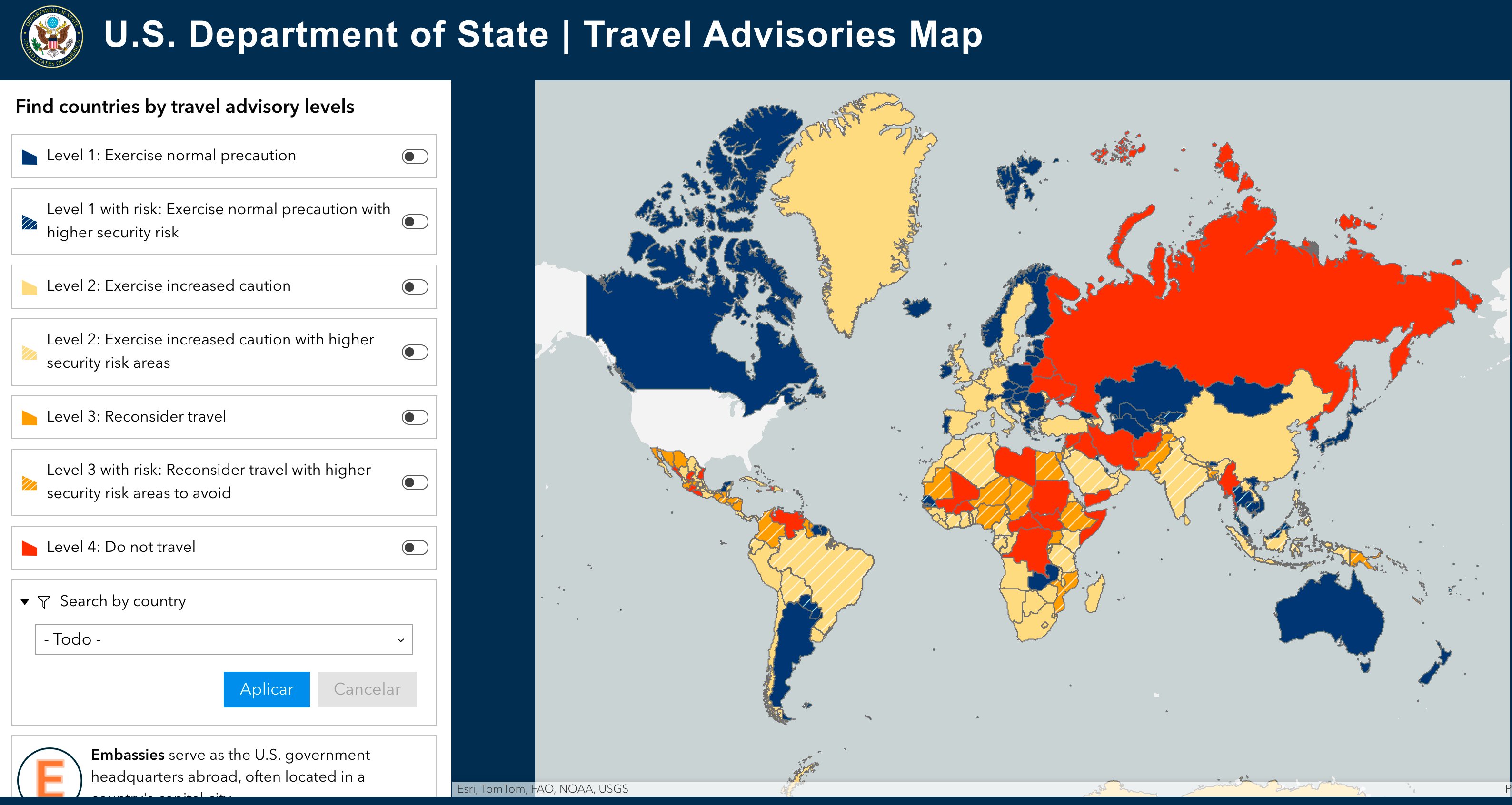 El mapa de destinos del Departamento de Estado de Estados Unidos es una herramienta informativa dirigida a los ciudadanos norteamericanos sobre los niveles de riesgo asociados con diferentes destinos internacionales, basándose en información recopilada sobre los datos de criminalidad, delincuencia, terrorismo, entre otros.