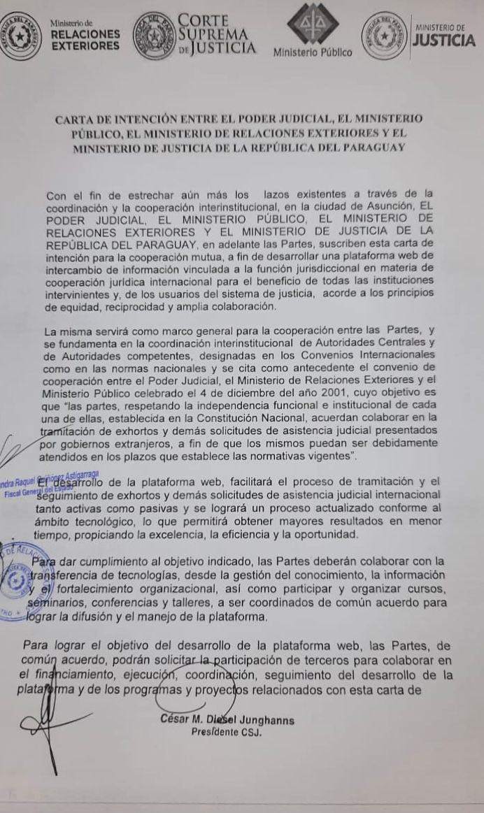Con el fin de estrechar aún más los lazos existentes a través de la coordinación y la cooperación interinstitucional, en la ciudad de Asunción, EL PODER JUDICIAL, EL MINISTERIO PÚBLICO, EL MINISTERIO DE RELACIONES EXTERIORES Y EL MINISTERIO DE JUSTICIA DE LA REPÚBLICA DEL PARAGUAY, en adelante las Partes, suscriben esta carta de intención para la cooperación mutua, a fin de desarrollar una plataforma web de intercambio de información vinculada a la función jurisdiccional en materia de cooperación jurídica internacional para el beneficio de todas las instituciones intervinientes y, de los usuarios del sistema de justicia, acorde a los principios de equidad, reciprocidad y amplia colaboración.