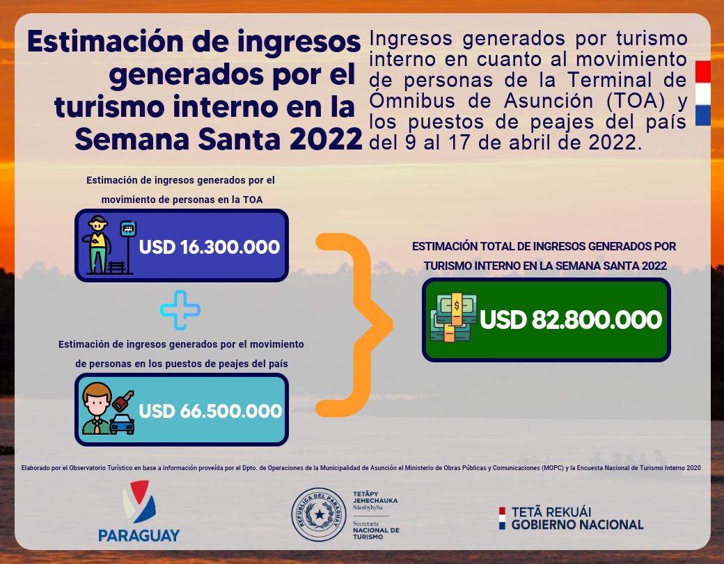 La suma global de los ingresos turísticos generados alcanza una cifra estimada de USD 82.800.000, con una amplia y dinámica movilización de personas en el territorio nacional.
