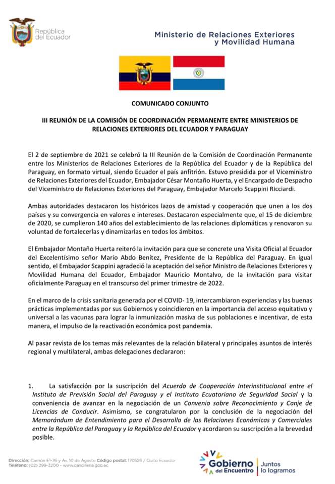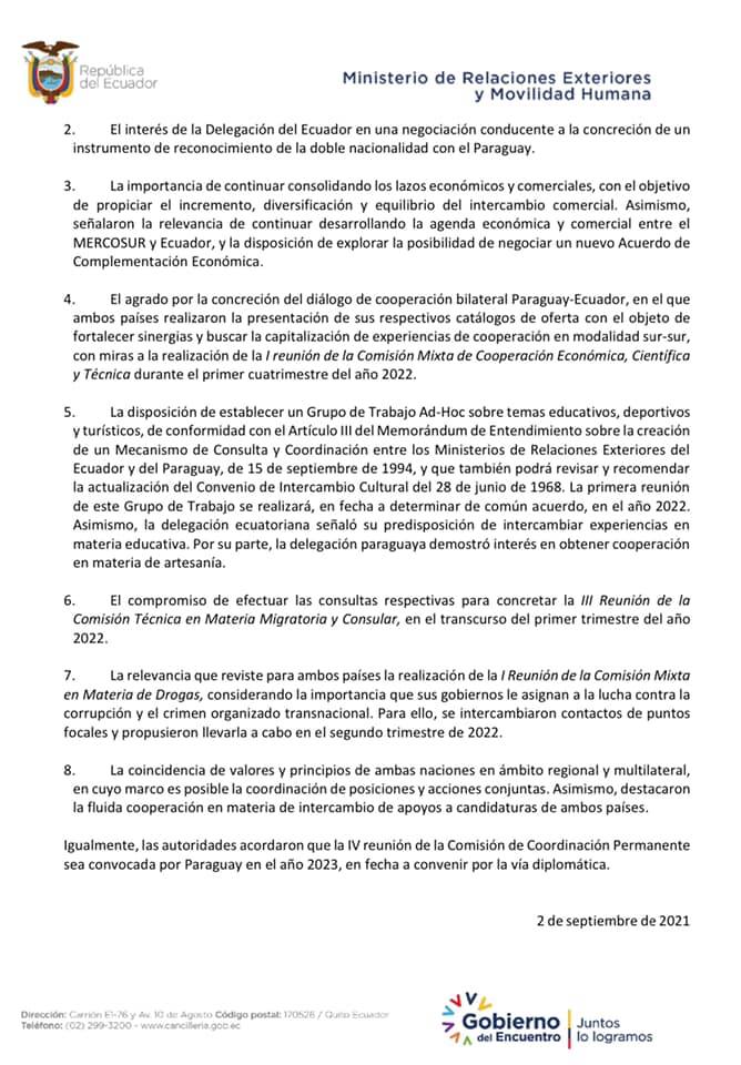 Ecuador y Paraguay afianzan su relación bilateral en el ámbito comercial, migratorio y el combate al narcotráfico.