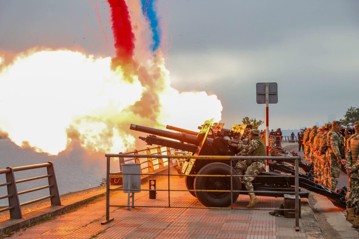 Salva de 21 cañonazos disparados en el amanecer del 15 de agosto de 2025 desde la Costanera de Asunción, captada por la Vicepresidencia.