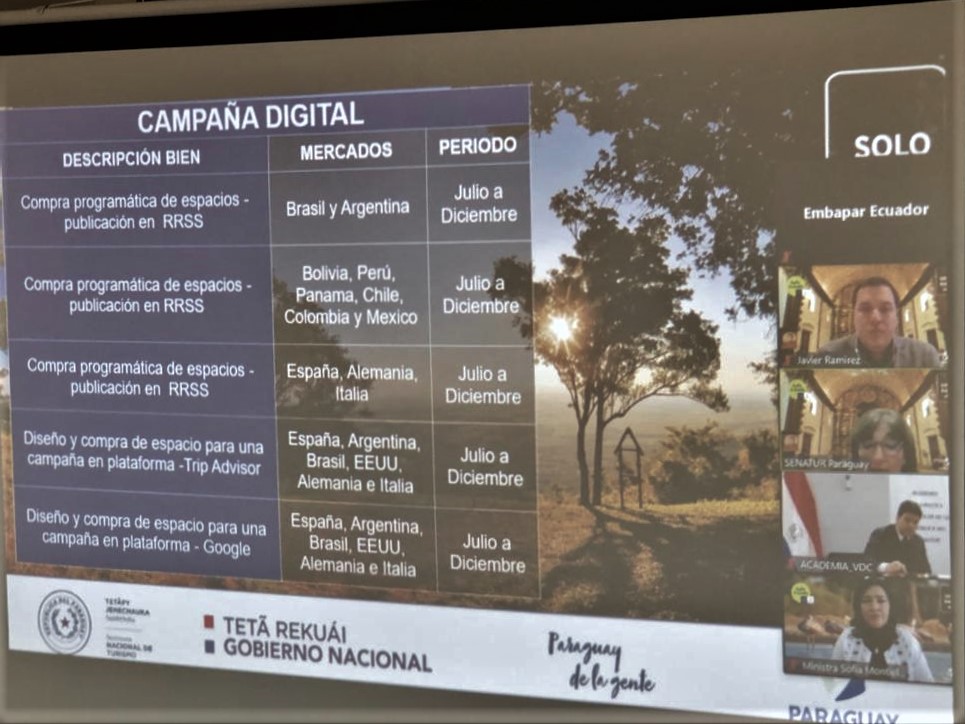 Los funcionarios de la Embajada del Paraguay en Ecuador participaron en el Webinar “Turismo en Paraguay”, organizado por la Academia Diplomática y Consular “Carlos Antonio López”, la Dirección de Relaciones Culturales y Turismo del Ministerio de Relaciones Exteriores y la Secretaría Nacional de Turismo (SENATUR).