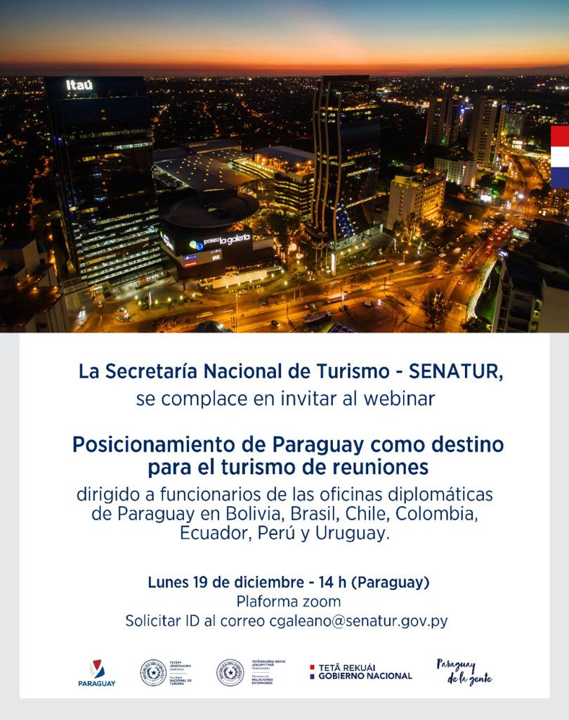 Funcionarios de las oficinas diplomáticas de Paraguay en Bolivia, Brasil, Chile, Colombia, Ecuador, Perú y Uruguay participaron del webinar organizado por la Senatur para dialogar sobre el posicionamiento de nuestro país como destino para el turismo de reuniones.