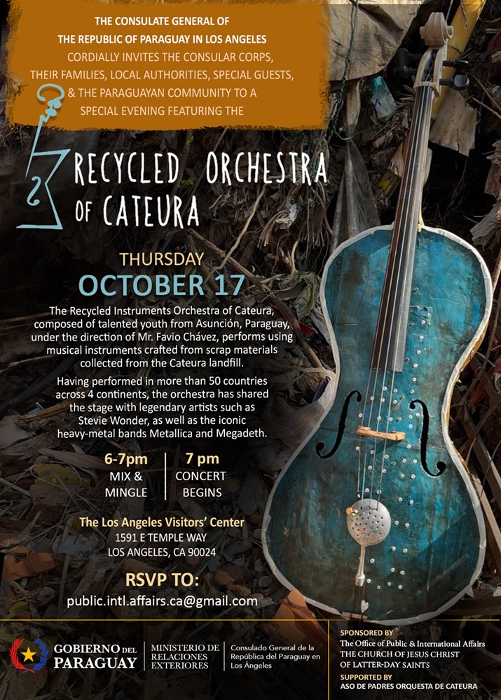 ____________As part of its USA 2024 tour, the Consulate General of the Republic of Paraguay in Los Angeles is pleased to invite you to participate in the concert that will be offered by the Orchestra of Recycled Instruments of Cateura, next Thursday, October 17th, in the city of Los Angeles. We are waiting for you to enjoy a very special evening, where these talented Paraguayan artists will delight us with a selection of their varied musical repertoire. It will undoubtedly be an inspiring experience.