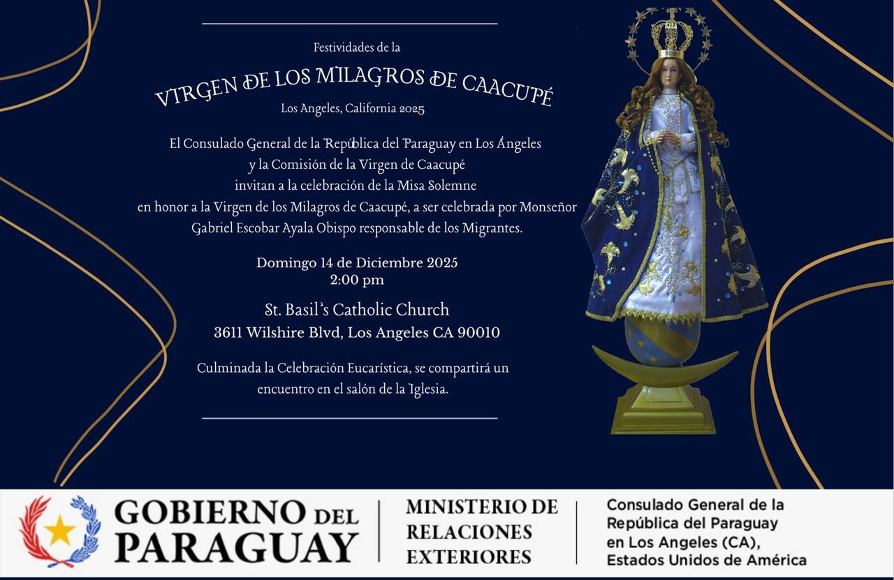 El Consulado General de la República del Paraguay en Los Ángeles invita cordialmente a la comunidad paraguaya, sus familias y amigos, a participar de las Festividades en honor a la Virgen de los Milagros de Caacupé, a celebrarse el domingo 14 de diciembre de 2025, en la ciudad de Los Ángeles.