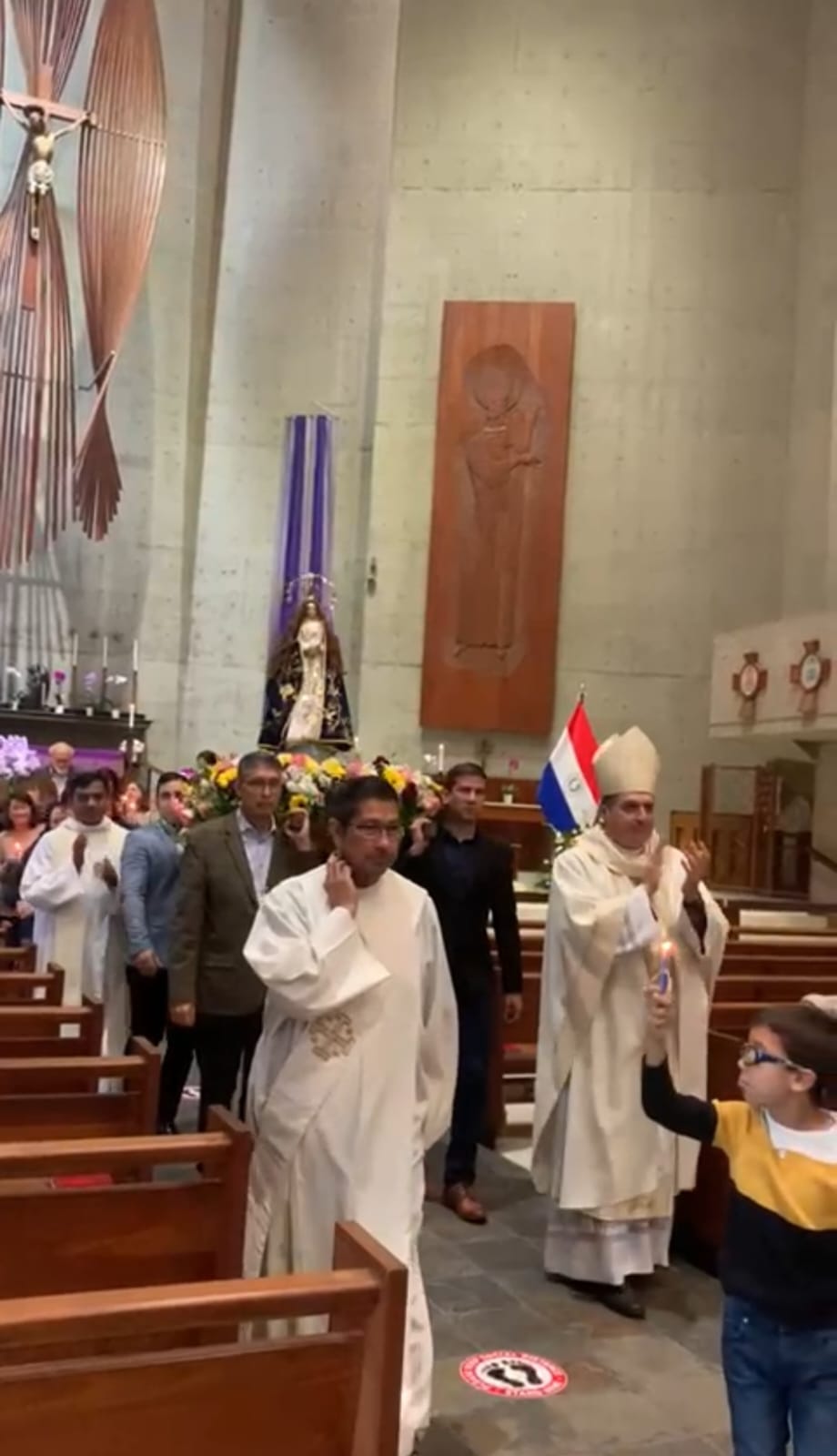 Instantáneas de la celebración de la Misa oficiada por el Monseñor Gabriel Escobar Ayala, Vicario Apostólico del Chaco Paraguayo y responsable de la Coordinación Nacional de Pastoral de la Movilidad Humana en honor a la Virgen de Caacupé llevada a cabo el 3 de diciembre pasado en la iglesia de San Basilio de la ciudad de Los Angeles.